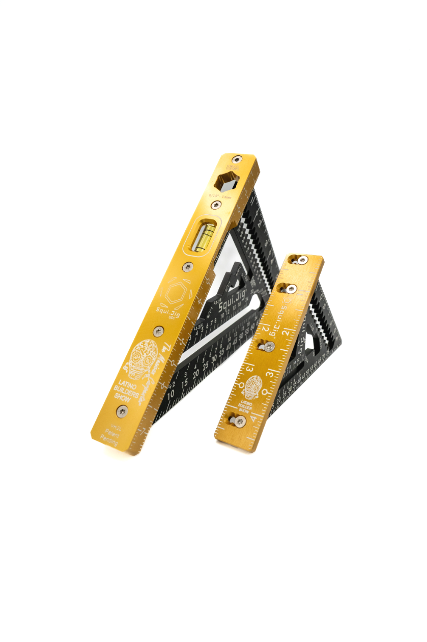 This limited-edition Squi Jig Fusion 4.5" Mini Pro Square is part of the official Latino Builders Show Edición, finished in the signature black and gold colorway chosen to represent leadership, craftsmanship, and pride within the Latino construction community. Designed for tight layout work, trim applications, and detailed marking, this compact square delivers maximum accuracy in a small footprint.
