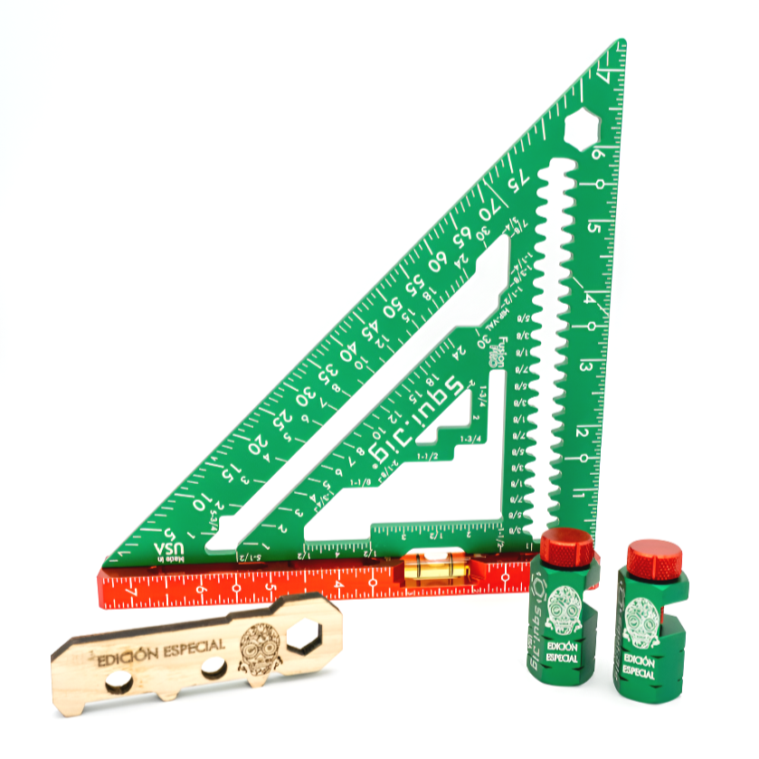 This Mexican Carpenter Edición Pro Set brings together two essential layout tools created through the collaboration between The Mexican Carpenter and Squi Jig. Finished in the signature green, white, and red colors chosen by The Mexican Carpenter, this set represents precision, craftsmanship, and cultural pride on the job site. Built for speed, accuracy, and professional performance, these tools deliver reliability backed by American machining.